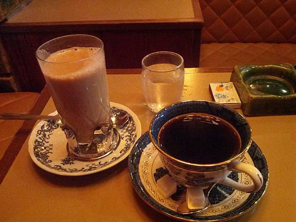 因為把前晚吃剩的鯖壽司當早餐,所以我們只點了拿鐵和招牌綜合咖啡。進店的時候,店內已經有三三兩兩的客人,點著香菸喝著咖啡,昭和風的擺飾裝潢裡漂著很緩慢的氣氛,讓人有午後三點的錯覺。